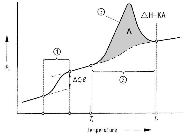 ③處的峰是指放熱峰(不同儀器測(cè)得的DSC曲線放熱方向可能不同,需注意)。由扣除基線之后所得到的峰面積A可得到熱變化焓△H: