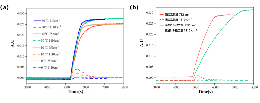 利用特征峰強(qiáng)度變化可對(duì)反應(yīng)物、產(chǎn)物和中間體的濃度及相對(duì)濃度變化過程進(jìn)行半定量分析。可以發(fā)現(xiàn),反應(yīng)物和產(chǎn)物的相對(duì)濃度之和在1110 cm-1吸收峰出現(xiàn)前后恒等于1,且在反應(yīng)過程中出現(xiàn)的下降趨勢(shì)與1110 cm-1吸收峰的變化趨勢(shì)相吻合。由此可以確認(rèn)1110 cm-1是半縮醛胺中間體的特征峰。