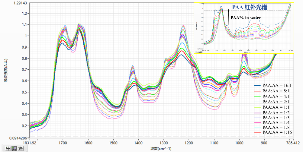 圖2 丙烯酸/PAA混合溶液紅外吸收光譜(丙烯酸/PAA質量比:1:16-16:1)