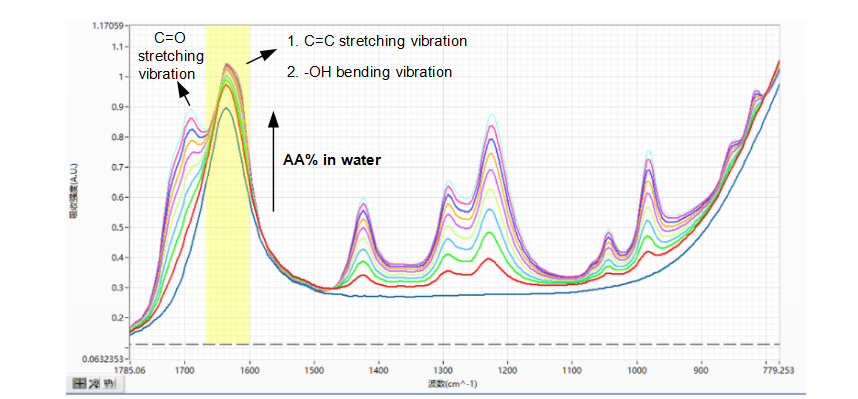 原位衰減全反射傅里葉變換紅外光譜(in-situ ATR-FTIR)目前已成功應用于自由基聚合、陰離子聚合和陽離子聚合等聚合反應研究,主要通過測定反應過程中碳碳雙鍵等特征基團的吸光度變化建立定量模型,計算單體濃度和轉化率[1,5,6]。然而該方法并不適用于半間歇式水相聚合體系,以聚丙烯酸(PAA)的水相溶液聚合反應為例,為控制反應平穩(wěn)進行,工業(yè)生產中通常會將部分丙烯酸單體、引發(fā)劑和鏈轉移劑溶液同時以滴加方式投入聚合釜內。如圖1所示,水中的羥基在1650 cm-1附近的紅外吸收峰強度較大,而碳碳雙鍵在臨近位置的吸收峰相對較弱,由于半間歇反應過程中水的濃度也會相應變化,將水的純譜作為背景直接進行扣除將顯著影響單體紅外定量的準確性。