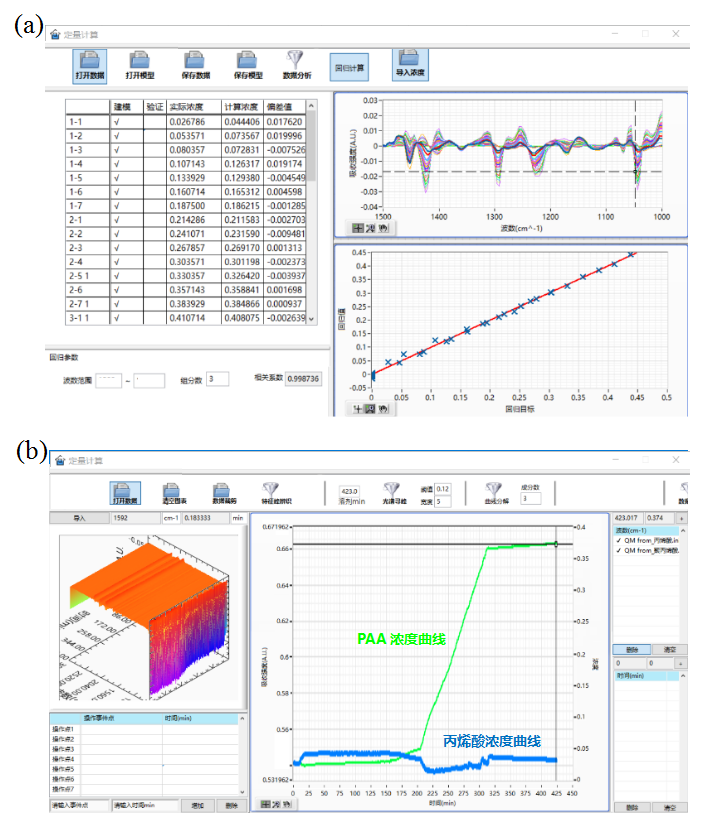 為解決水對目標成分定量的影響,可應用抗干擾能力較強的偏最小二乘法(Partial Least Squares,PLS)進行定量分析。首先,采集不同質量濃度比的丙烯酸/PAA混合溶液紅外光譜(圖2),隨后將光譜數據進行預處理,最后利用PLS回歸算法關聯(lián)光譜信息與丙烯酸、PAA的質量濃度信息建立定量校正模型。如圖3所示,通過該模型計算得到的樣品濃度預測值與真實值具有很好的相關性,丙烯酸定量的相關系數達到0.9987,而PAA達到0.9940(圖3a)。因此,在PAA水相溶液聚合過程中,通過實時采集不同時刻聚合體系的紅外光譜,并結合該定量模型能夠準確地測定丙烯酸單體和PAA的瞬時濃度(圖3b),從而方便地對聚合反應表觀動力學參數進行擬合計算。