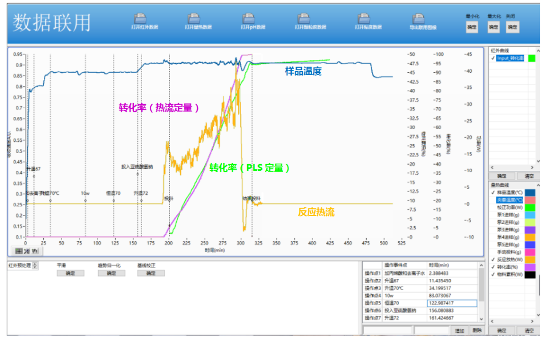 計算不同時刻PAA濃度與總濃度的比值可以得到丙烯酸單體轉化率曲線,單體的最終轉化率為92.3%。另外,利用ICPA平臺的在線量熱功能可以表征半間歇聚合反應的實時放熱情況,放熱熱流曲線間接反映了聚合速率變化。同時,通過計算累計的放熱量也可以得到反應轉化率曲線,本質上該曲線體現了聚合反應完成度變化,同樣可以表現反應的動力學特征。如圖4所示,通過數據聯(lián)用,可以發(fā)現紅外定量與量熱得到的反應轉化率曲線趨勢基本一致,可以相互印證上述兩種ICPA技術對于本案例動力學研究的適用性與準確性。除水相溶液聚合反應外,本文介紹的方法同樣適用于其他水相反應體系,可降低或消除水對目標物質定量分析的干擾。