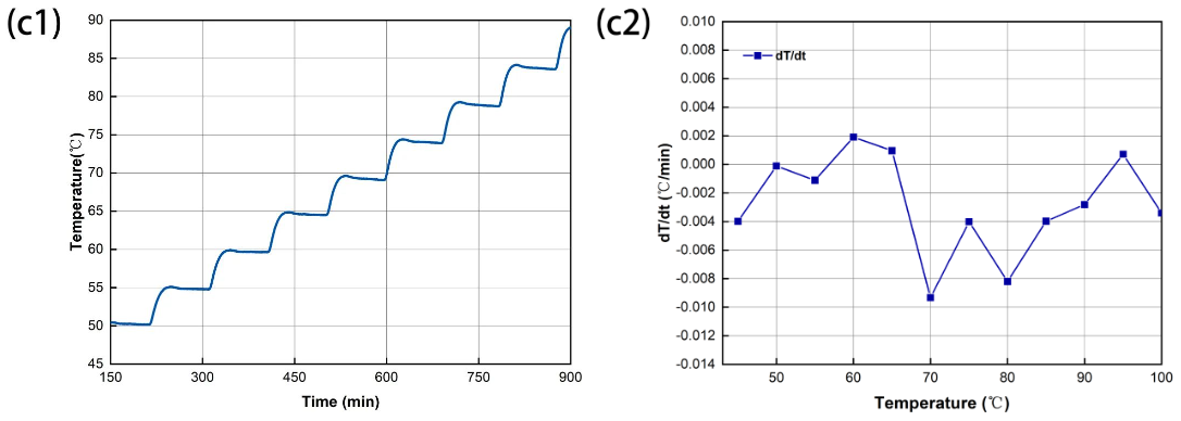(1) 校準(zhǔn)文件合格性判據(jù)統(tǒng)計每個臺階達到溫度平衡階段后鋁塊的溫升速率。如圖4a所示,若各臺階的溫升速率均處于一個遠小于檢測閾值的區(qū)間內(nèi),可判定校準(zhǔn)文件合格,說明試樣處于相對嚴(yán)格的絕熱環(huán)境中,在0.02℃/min的檢測閾值條件下可準(zhǔn)確進行電池Tonset點判定,出現(xiàn)誤判或明顯偏差的可能性低。而如圖4b和圖4c所示,均為不合格的情況。圖4b鋁塊各臺階的溫升速率過大,說明壁面對試樣存在過加熱的情況,進行電池實驗時可能導(dǎo)致Tonset點在電池未開始自放熱階段被提前檢出。該情況下,需要通過延長恒溫時間等方式重新進行溫差基線校準(zhǔn);圖4c對應(yīng)的樣品尺寸很小、熱慣量過低,因此爐腔內(nèi)微弱的溫度場擾動導(dǎo)致樣品溫升速率劇烈波動,進行電池實驗時發(fā)生Tonset誤檢測概率高。上述情況建議更換適用于小電芯檢測的儀器進行測試。