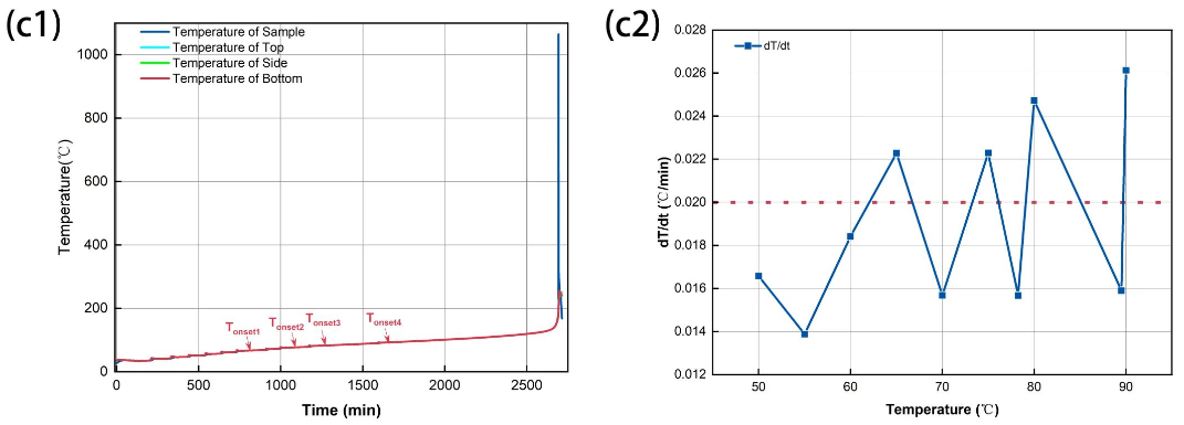 3) 只存在一個Tonset溫度。圖7b出現(xiàn)2個Tonset,上述現(xiàn)象有一定概率會發(fā)生,可能與SEI膜分解和再生的動態(tài)平衡有關(guān),但更可能是校準(zhǔn)文件不理想帶來的結(jié)果;圖7c使用圖4c的校準(zhǔn)文件進行測試,相鄰臺階的溫升速率無規(guī)波動,可能出現(xiàn)多次檢出Tonset的反常結(jié)果。