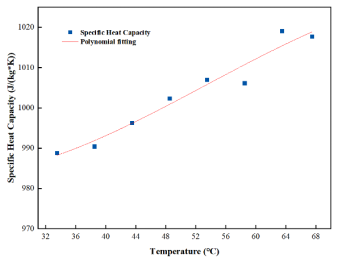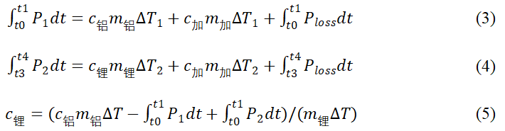使用絕熱量熱儀可以對電池的比熱容進行測試。實驗中選用一個和電池同尺寸的鋁塊作為參比樣,基于差示絕熱追蹤的原理如圖10、11及式(3)、(4)、(5)所示,可以得到一定溫度區(qū)間內的平均比熱容和變溫比熱容。