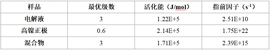 使用絕熱量熱儀可以對電池正負極材料、電解液等單組分或混合組分進行熱分析,得到對應的起始分解溫度、溫升速率、壓升速率、分解熱量等數(shù)據,并進一步計算電池材料的熱分解反應熱力學與表觀動力學參數(shù);電池材料的熱分解特性參數(shù)與電池單體的熱失控參數(shù)進行對比分析,可以研究電池熱失控的反應機理。使用TAC-500A對高鎳正極材料、電解液及高鎳正極材料+電解液的混合物分別進行熱分解測試,結果如圖3所示,并可根據熱分解曲線,求解各試樣的反應動力學參數(shù)如表1所示。