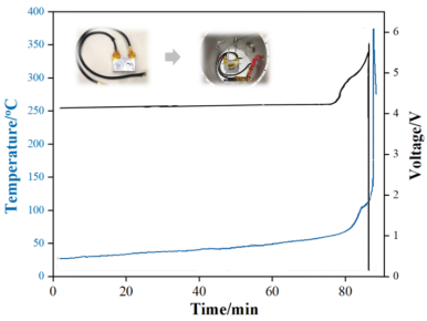絕熱量熱儀可以連接充放電設備對電池的過充電、過放電、連續(xù)充放電等電濫用失控過程進行測試。使用BAC-420A對NCM電池進行過充電的熱失控測試如圖6所示。