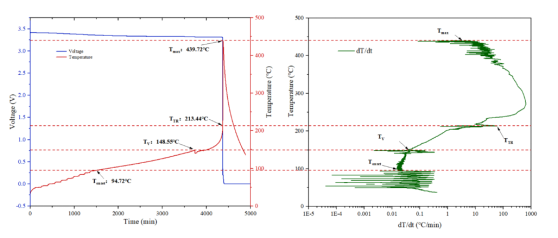 絕熱量熱儀可以通過附加的針刺模塊進行電池的機械濫用測試,模擬電池在受到機械損傷的情況。使用BAC-420A對305Ah的磷酸鐵鋰電池進行的針刺實驗熱失控過程溫度曲線如圖8所示。