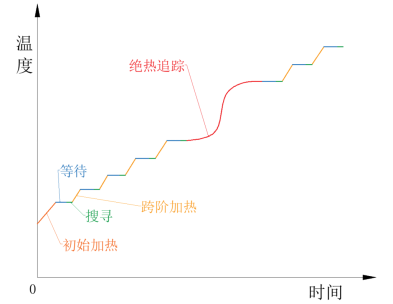 為了能夠使試樣在實驗過程中在相對絕熱的環(huán)境中檢測出其初始反應溫度,使用“HWS”的升溫程序,即“加熱-等待-搜尋”的臺階升溫模式,如圖2所示。“HWS”模式可以保證每個臺階的最后階段均給樣品提供較好的絕熱環(huán)境,因此當“搜尋”出的試樣溫升速率超過一定閾值后,實驗就會進入絕熱追蹤階段,該階段內爐體溫度會隨樣品溫度的變化而即時調整,確保試樣始終處于動態(tài)熱封閉狀態(tài)。