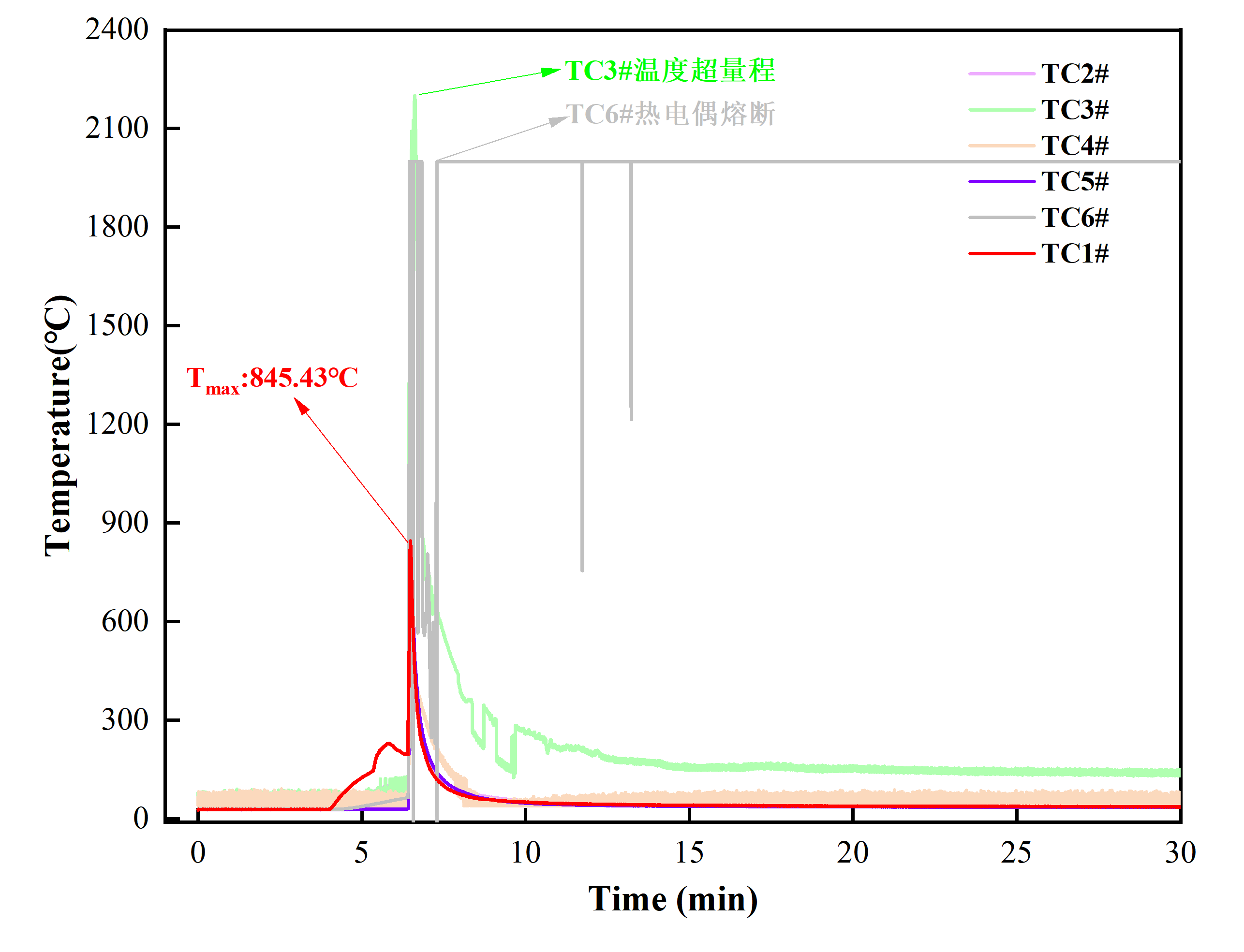 對(duì)圖2的溫度數(shù)據(jù)進(jìn)行分析發(fā)現(xiàn),該電池的熱失控最高溫度845.43℃,熱失控最大溫升速率74628℃/min。而規(guī)格相近的同類(lèi)型液態(tài)鋰離子電池采用同樣熱濫用方式熱失控最高溫度>1000℃,熱失控最大溫升速率>150000℃/min??梢?jiàn),固態(tài)鋰金屬電池較液態(tài)鋰離子電池安全性能確實(shí)得到提升。