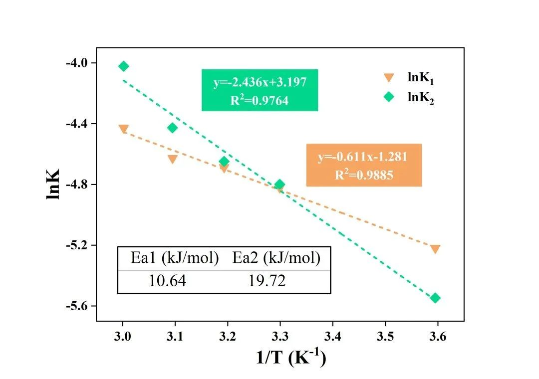 進(jìn)一步根據(jù)阿倫尼烏斯方程lnk=lnA-Ea/RT對(duì)lnk與1/T進(jìn)行線性擬合,可計(jì)算得到表觀活化能Ea1和Ea2,結(jié)果如下圖所示: