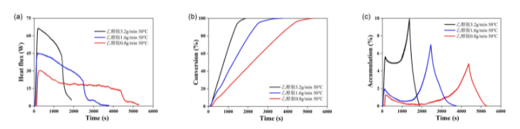 我們將通過紅外與在線量熱分別計(jì)算得到的轉(zhuǎn)化率曲線進(jìn)行對(duì)比,可以發(fā)現(xiàn)兩者非常接近。可以認(rèn)為前者代表了反應(yīng)物轉(zhuǎn)化率變化,后者代表了反應(yīng)完成度變化,均可以體現(xiàn)反應(yīng)的動(dòng)力學(xué)特征。理論上,化學(xué)反應(yīng)轉(zhuǎn)化率越高,兩者的差異越小。