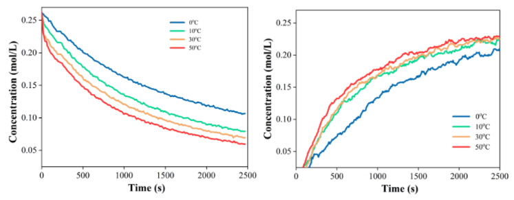 在0℃、10℃、30℃、50℃的等溫條件下進(jìn)行間歇式反應(yīng),反應(yīng)過程中原位采集體系紅外光譜,獲得1710 cm-1和 753cm-1吸收峰的強(qiáng)度隨時(shí)間變化數(shù)據(jù)。結(jié)果如下圖所示: