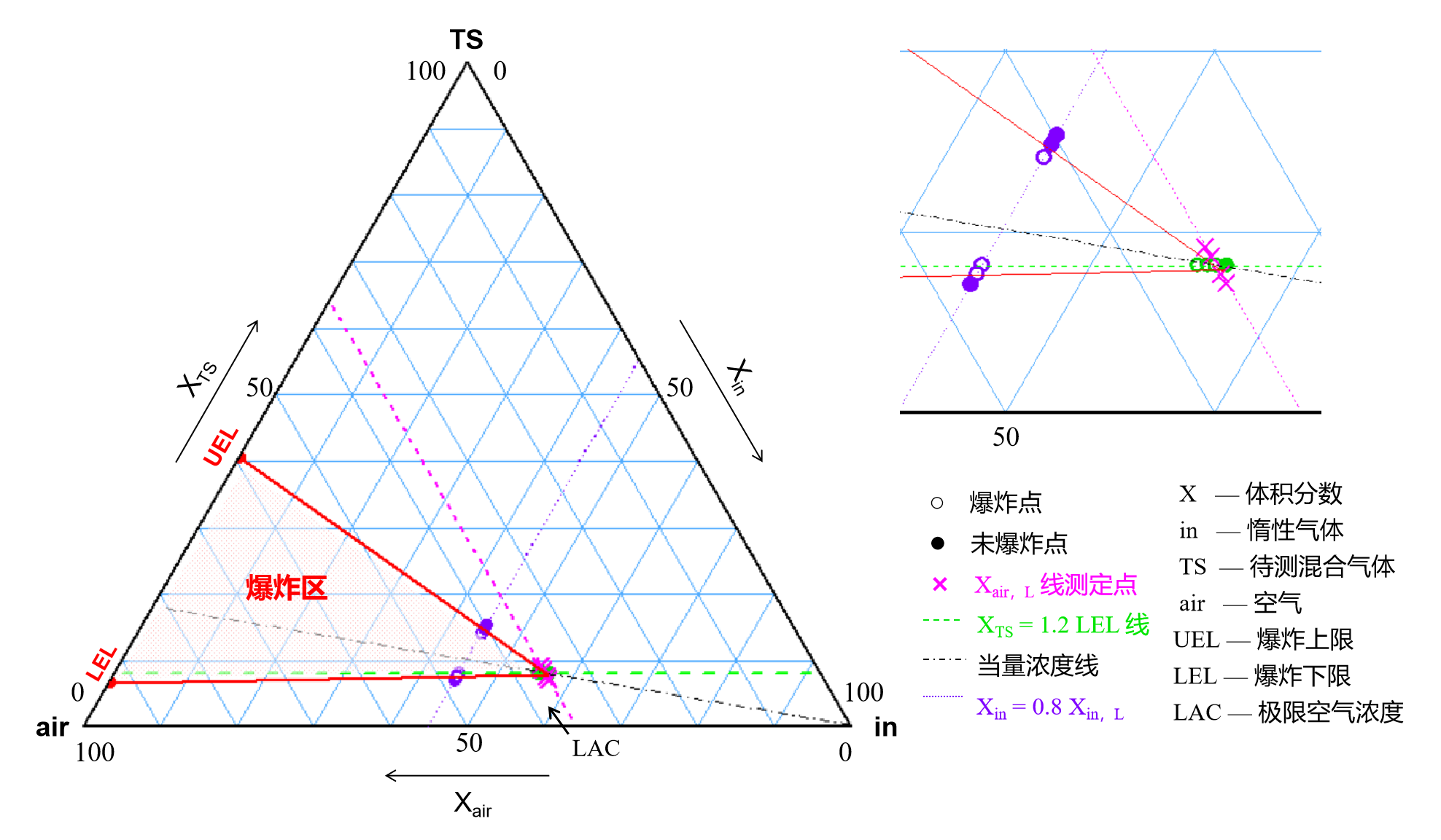 如圖4所示,通過程序?qū)嶒?yàn)逐步確定爆炸區(qū)頂點(diǎn)空氣體積分?jǐn)?shù)(Xair,L),并測定0.8倍頂點(diǎn)惰性氣體體積分?jǐn)?shù)(0.8 Xin,L)的混合氣體爆炸極限,以驗(yàn)證極限空氣濃度LAC位于爆炸區(qū)頂點(diǎn),此時(shí):