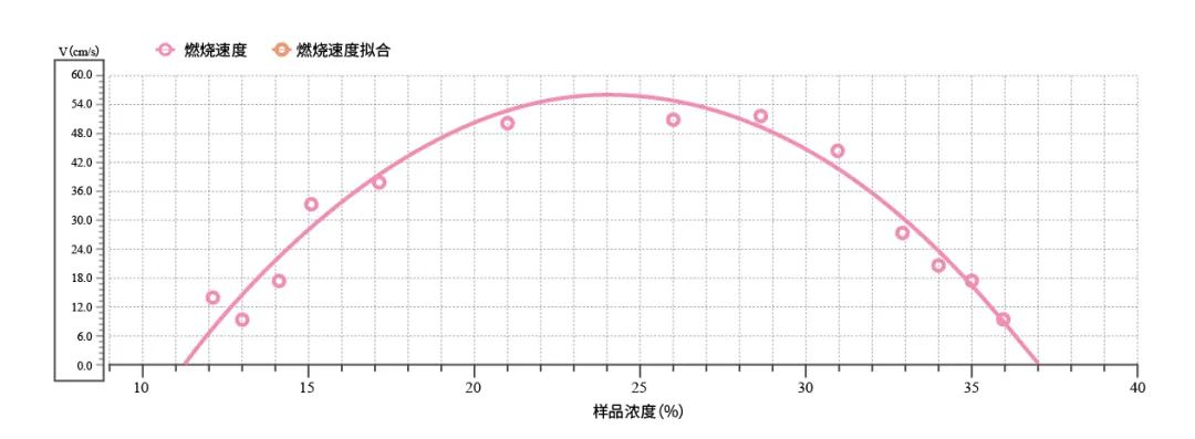 本次實驗通過人工配氣模擬某款儲能電芯熱失控所產(chǎn)生的可燃混合氣體,并使用仰儀科技FPV-400A氣體燃燒速率測試儀進行測試。實驗結(jié)果表明,混合氣濃度為24.20Vol%時,氣體燃燒速率達到最大值56.04cm/s。
