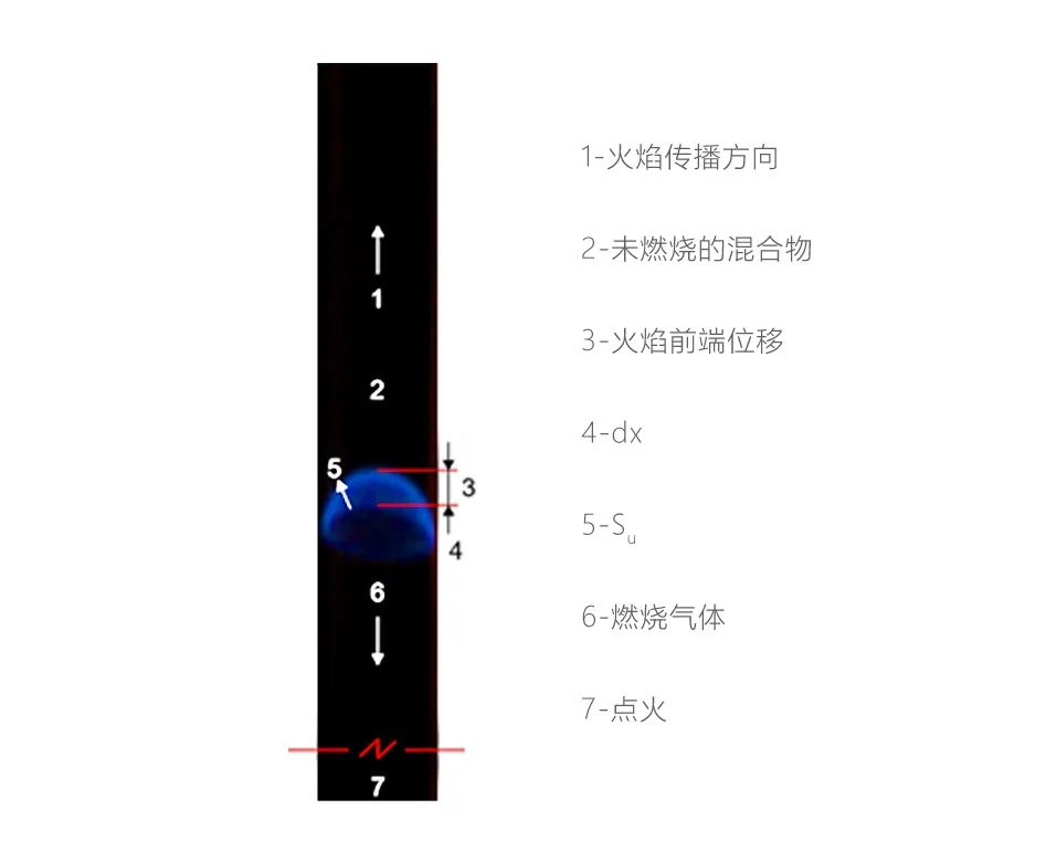 本方案參照UL9540A-2019所引用的“ISO 817-2014 制冷劑——命名和安全分類”標準方法。基本測試原理為:點燃待測可燃氣體與底部點火端開放的垂直細長管內(nèi)的空氣所形成的均質(zhì)混合物,引發(fā)火焰向上部封閉端進行傳播(如圖2所示)。在火焰穩(wěn)定傳播階段,攝像機實時記錄火焰狀態(tài),通過圖像處理算法提取火焰形態(tài),計算火焰冠表面積和火焰燃燒速度。