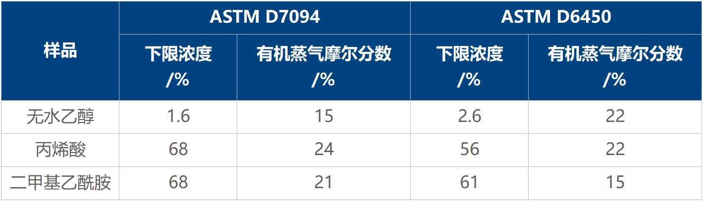 另外,ASTM D6450 和 ASTM D7094 兩種方法對(duì)于單一濃度閃點(diǎn)值的測(cè)試結(jié)果呈現(xiàn)較高的一致性,但在樣品量、加熱速率、空氣導(dǎo)入量等方面的差異導(dǎo)致測(cè)定的濃度下限存在一定區(qū)別(見圖 2 和表 1)。由于測(cè)試流程中蒸氣濃度累積至 LFL 是一個(gè)復(fù)雜的非線性、多因素耦合過程,濃度下限與檢測(cè)方法之間并沒有體現(xiàn)出很好的規(guī)律性。