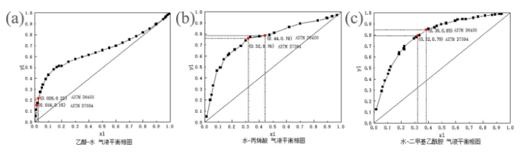 圖 2 (a)乙醇、(b)丙烯酸和(c)二甲基乙酰胺與水的二元體系氣液平衡相圖
