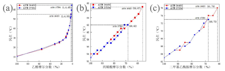 圖 1 (a)乙醇、(b)丙烯酸和(c)二甲基乙酰胺溶液閃點(diǎn)稀釋曲線