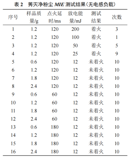 研究結(jié)果表明,莠滅凈粉塵屬非導(dǎo)電性粉塵,粉塵云最小點(diǎn)火能在有、無電感負(fù)載放電方式下分別為3~6、12~25mJ,粉塵云最低著火溫度480℃,粉塵云爆炸下限質(zhì)量濃度30~50g/m3,粉塵云極限氧體積分?jǐn)?shù)10%。莠滅凈粉塵到達(dá)熔點(diǎn)后熔化且熔化前未著火,其粉塵層最低著火溫度無意義。
