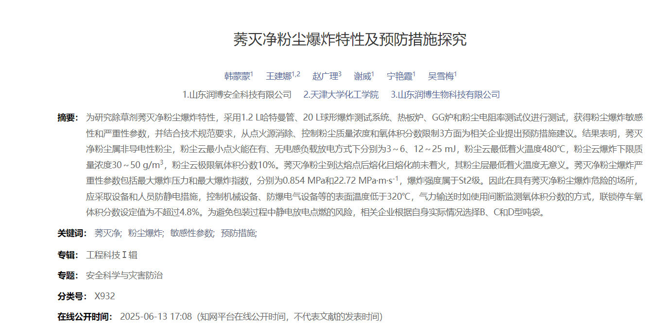 近期,山東潤博安全科技有限公司高級工程師韓蒙蒙等人在《工業(yè)安全與環(huán)保》(Industrial Safety and Environmental Protection)期刊發(fā)布《莠滅凈粉塵爆炸特性及預(yù)防措施探究》的論文,該論文由山東潤博安全科技有限公司、天津大學(xué)化工學(xué)院和山東潤博生物科技有限公司聯(lián)合支持。