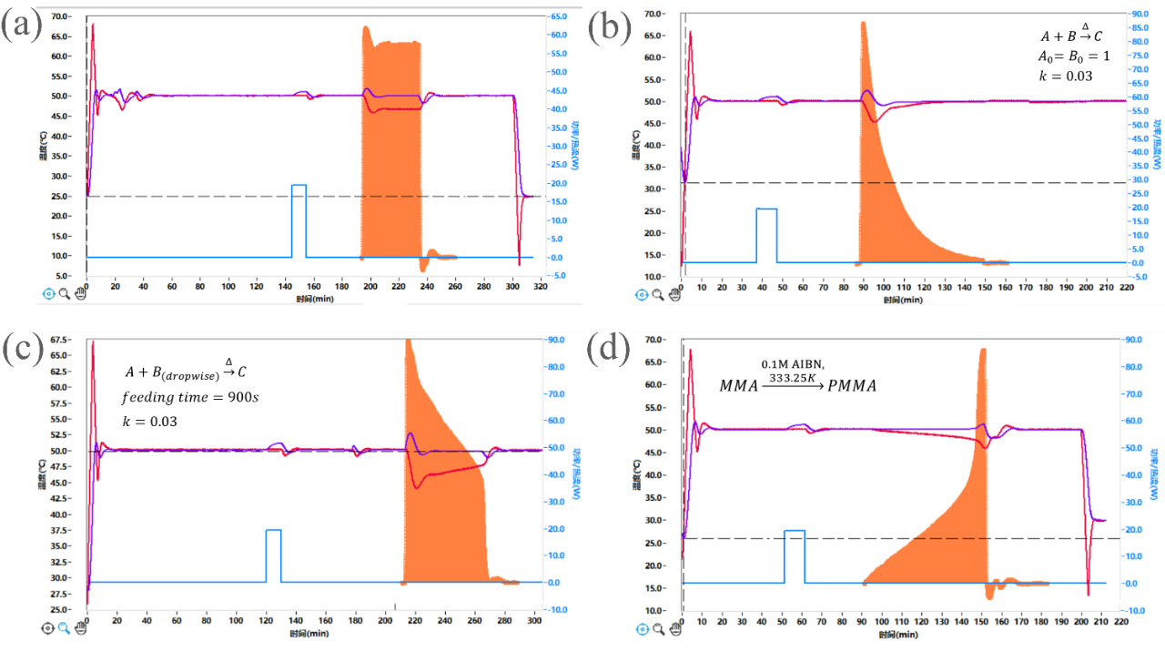 通過電源和加熱器進行模擬熱發(fā)生,分別模擬了間歇式零級反應(yīng)(60W恒功率放熱)、間歇式二級反應(yīng)、半間歇式二級反應(yīng)以及具有一定自加速特征的聚甲基丙烯酸甲酯自由基聚合反應(yīng)的放熱變化趨勢[1]。上述模型反應(yīng)的量熱結(jié)果如圖3所示,橘黃色的熱流曲線能夠很好地匹配各反應(yīng)的動力學(xué)特征。