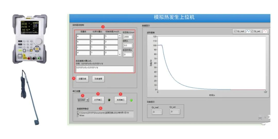 如圖2所示,在“模擬熱發(fā)生控制上位機”軟件中輸入模型反應(yīng)的動力學(xué)方程,控制直流電源按照上位機實時計算的功率驅(qū)動反應(yīng)釜內(nèi)的加熱棒產(chǎn)熱。計算功率和電源的實際輸出功率顯示在右側(cè)波形圖中。反應(yīng)量熱儀在“熱流”模式下對加熱棒熱功率進行測量,并將測量數(shù)據(jù)與電源實際輸出功率進行比較。反應(yīng)量熱儀在“熱流”模式下對發(fā)熱過程進行測量,并將測量數(shù)據(jù)與電源輸出功率進行比較。
