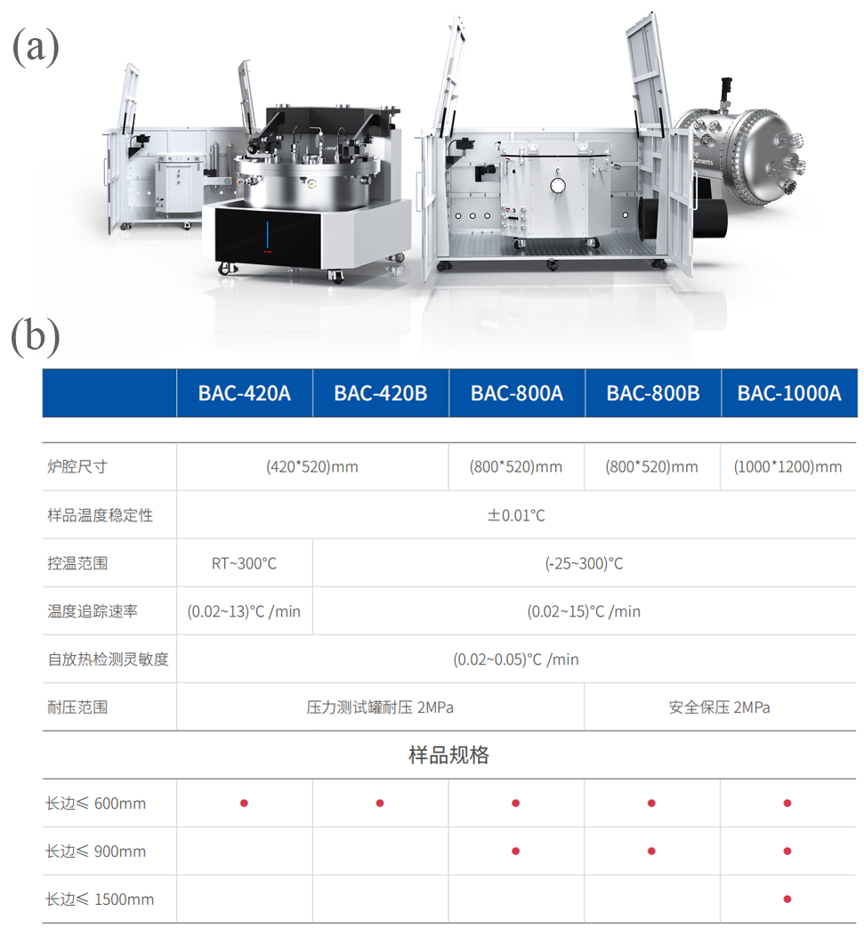 仰儀科技長期致力于鋰電池?zé)岚踩珯z測儀器和解決方案開發(fā),公司研制的BAC-420A大型電池絕熱量熱儀打破國外壟斷,已成功進行了包括190Ah NCM811、230Ah NCM622、320Ah LPF和600mm短刀在內(nèi)的數(shù)百款電芯的絕熱熱失控和熱物性參數(shù)測試,積累了大量的儀器開發(fā)和應(yīng)用經(jīng)驗。針對現(xiàn)有電池絕熱儀器的應(yīng)用限制,仰儀科技創(chuàng)新研發(fā)BAC系列全尺寸大型電池絕熱量熱儀,腔體直徑覆蓋420mm-1000mm的范圍,能夠測試長邊尺寸不超過1500mm的電芯;同時,大容量腔體的抗爆性和產(chǎn)氣測試能力顯著提升,能夠承受大型電芯的熱失控溫壓沖擊。另外,考慮用戶差異化的使用習(xí)慣和測試需求,系列化產(chǎn)品兼顧了腔體開蓋泄壓和腔體密閉-定向泄壓兩種技術(shù)路線以供選擇。除常規(guī)熱濫用測試以外,BAC系列產(chǎn)品具備氣體收集和壓力測量、針刺模塊、視頻監(jiān)控、充放電測試、比熱容測試、氣氛模擬和低溫制冷等功能,可以對電池?zé)岚踩赃M行全面評估。系列化儀器的核心參數(shù)如下圖所示: