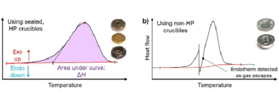圖7 使用不同耐壓坩堝的DSC曲線:a)理想的放熱分解DSC曲線(高壓坩堝);b)異常吸熱峰(普通鋁坩堝)。[3]