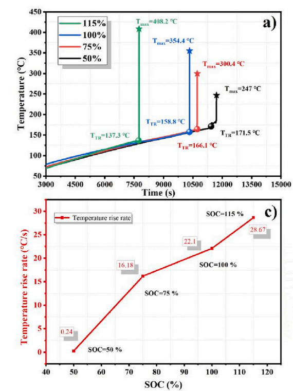 本文引用重慶理工大學(xué)林春景課題組近期發(fā)表的文章來具體說明熱失控特征參數(shù)與電池電量之間的關(guān)系。文章中使用50%、75%、100%以及115% 4個(gè)不同SOC的電池,利用ARC的掃描模式進(jìn)行熱失控實(shí)驗(yàn)[1]。