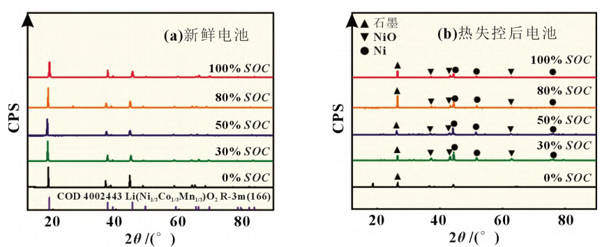 以上研究說明高電量更容易導(dǎo)致電池?zé)崾Э氐陌l(fā)生,且熱失控劇烈程度會(huì)更高、燃爆現(xiàn)象更明顯。上?;ぱ芯吭簝?chǔ)德韌等[3]研究認(rèn)為正極材料的熱分解是電池?zé)崾Э氐闹匾襟E,也是導(dǎo)致高電量電芯更易失控的原因之一,為此他們使用了XRD對熱失控前后正極材料的晶體結(jié)構(gòu)進(jìn)行了分析。