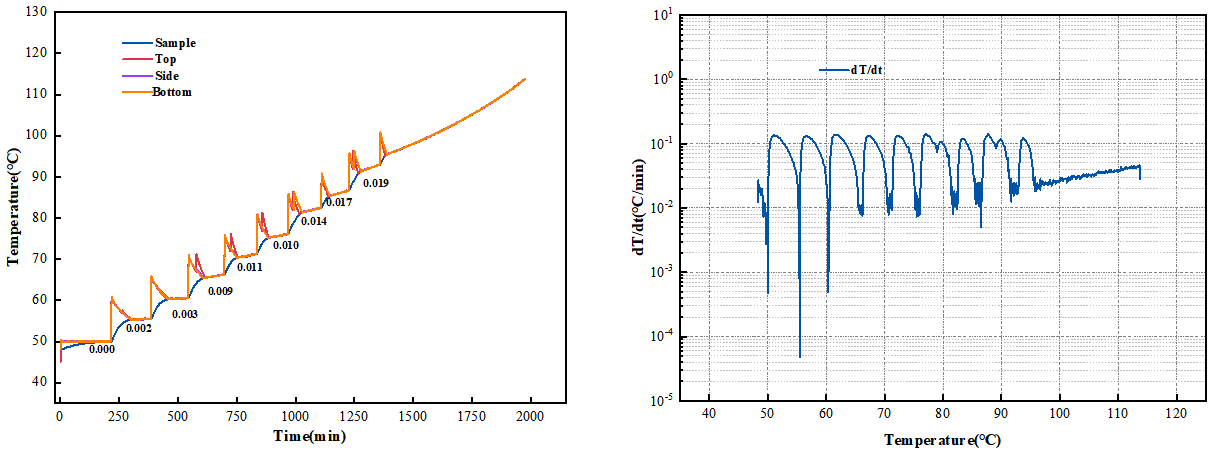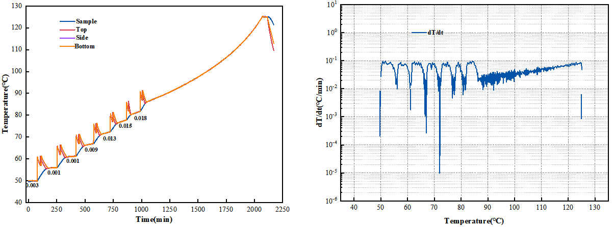 圖5使用金屬板夾具的標(biāo)準(zhǔn)電阻塊HWS溫升(左圖)及溫升速率-溫度(右圖)曲線