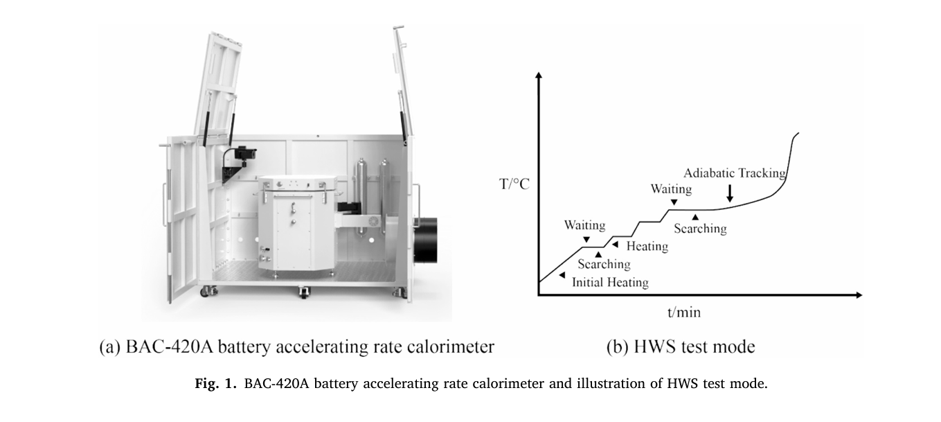 本次研究采用的BAC-420A大型電池絕熱量熱儀專(zhuān)為大型電池單體及小型模組設(shè)計(jì),其絕熱腔體有效尺寸達(dá) 420×520mm,可滿(mǎn)足長(zhǎng)邊不超過(guò) 600mm電池的熱失控測(cè)試需求。該儀器絕熱性能卓越,壁樣溫差≤0.5℃,自放熱檢測(cè)靈敏度可達(dá)到0.005°C/min,遠(yuǎn)超行業(yè)常規(guī)檢測(cè)閾值 0.02°C/min。能夠敏銳捕捉電池?zé)崾Э剡^(guò)程中的細(xì)微溫度變化,精準(zhǔn)測(cè)定自放熱起始溫度(Tonset)、熱失控起始溫度(TTR)、熱失控最高溫度(Tmax)及最大溫升速率(dT/dt)max等關(guān)鍵熱動(dòng)力學(xué)參數(shù)。同時(shí)該儀器符合 GB/T 36276 - 2023《電力儲(chǔ)能用鋰離子電池》“絕熱溫升特性” 實(shí)驗(yàn)要求。為電池安全性能評(píng)估、熱管理開(kāi)發(fā)及熱失控防控研究提供有力的數(shù)據(jù)支持。此外,該儀器還榮獲2024年“國(guó)產(chǎn)好儀器”稱(chēng)號(hào),口碑備受贊譽(yù)。