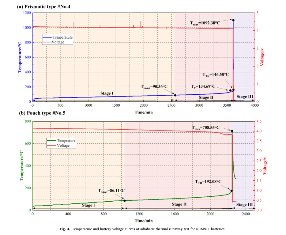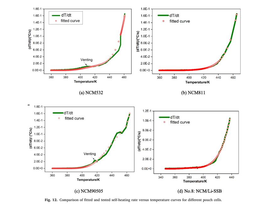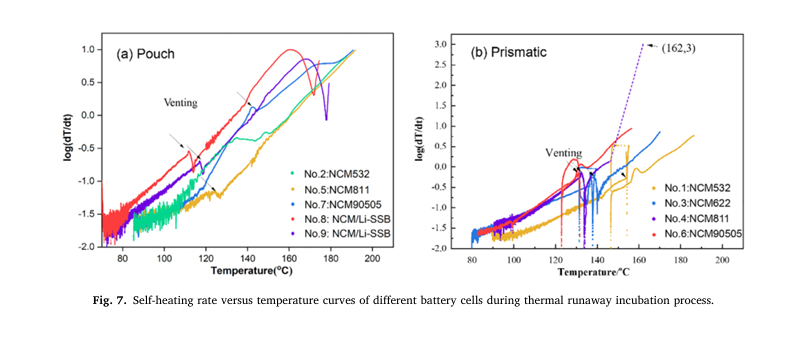 2.同一體系的方形和軟包鋰離子電池的熱失控過(guò)程存在差異。方形電池的TTR隨著鎳含量的增加而降低,從NCM532的186.49°C逐漸降低至NCM90505的156.92°C,而軟包電池的TTR保持在190°C左右。此外,軟包電池在達(dá)到TTR后會(huì)有一個(gè)誘導(dǎo)期才會(huì)快速升溫。