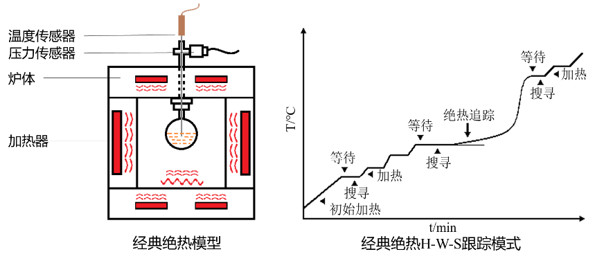 絕熱加速量熱儀的經(jīng)典工作模式為“加熱—等待—搜尋”(H-W-S)模式,工作前可設(shè)置實(shí)驗(yàn)起始溫度、終止溫度、斜率敏感度、加熱幅度和等待時(shí)間等參數(shù)。“加熱”階段,量熱儀的溫度按設(shè)定的加熱幅度升高;“等待”階段,控制器通過比較樣品室溫度與絕熱爐各個(gè)區(qū)域的溫度,保持絕熱爐內(nèi)的溫度處于均勻平衡狀態(tài);“搜尋”階段,若檢測(cè)到樣品升溫速率大于設(shè)置的閾值(如0.02℃/min),則進(jìn)入絕熱追蹤階段,通過程序控溫保持樣品池四周的絕熱環(huán)境;否則,量熱儀自動(dòng)進(jìn)入下一個(gè)“加熱—等待—搜尋”流程。